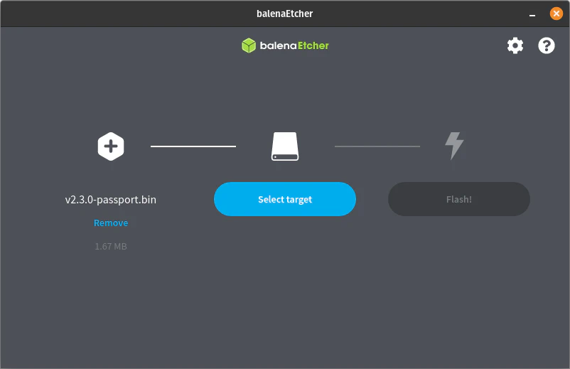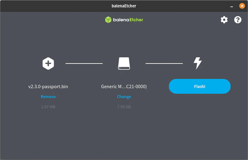 - Click Flash! This will write the firmware file as an image to the SD card. Once complete, remove the SD card and insert into the top of Passport.