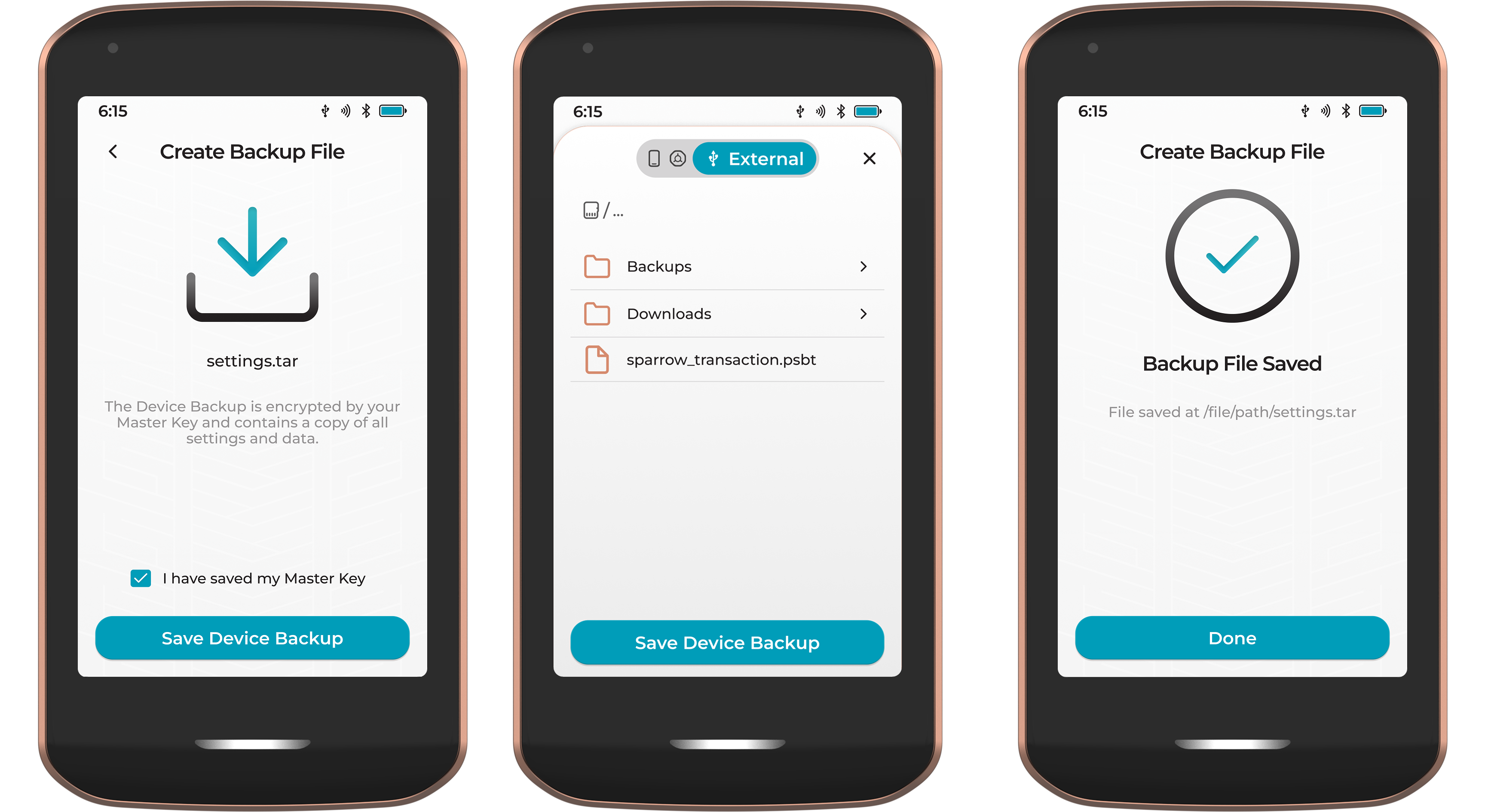 After creating the Master Key backup, Prime will prompt the user to save a copy for the Settings & Data backup file. This file is encrypted with the Prime Master Key and should be saved onto an external storage medium like an SD card or USB drive.