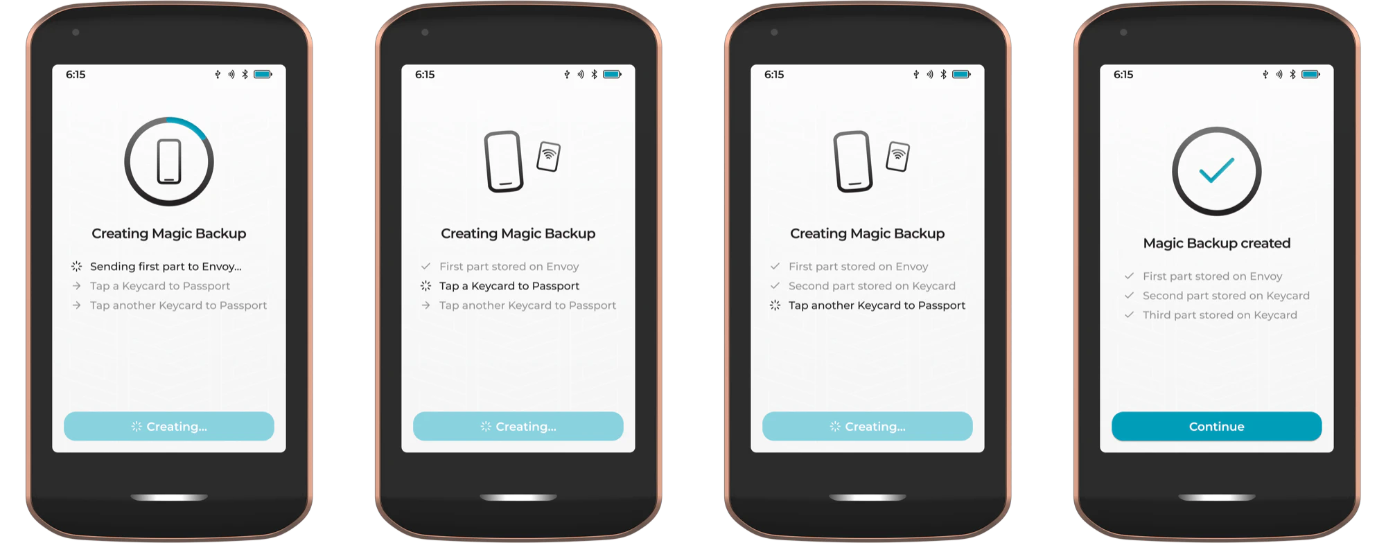Enabling Magic Backups will create a secure and resilient backup of the Prime Master Key. The Master Key will be split into three parts. Two will be stored on physical Keycards, and a third will be stored on Envoy, encrypted, and backed up to the user’s Apple or Google account. Prime’s Settings & Data will be backed up to the Foundation servers. This data file is encrypted on Prime with the Master Key, then sent via QuantumLink to Envoy, and on to the Foundation server for storage. The file includes device settings, files and app data.