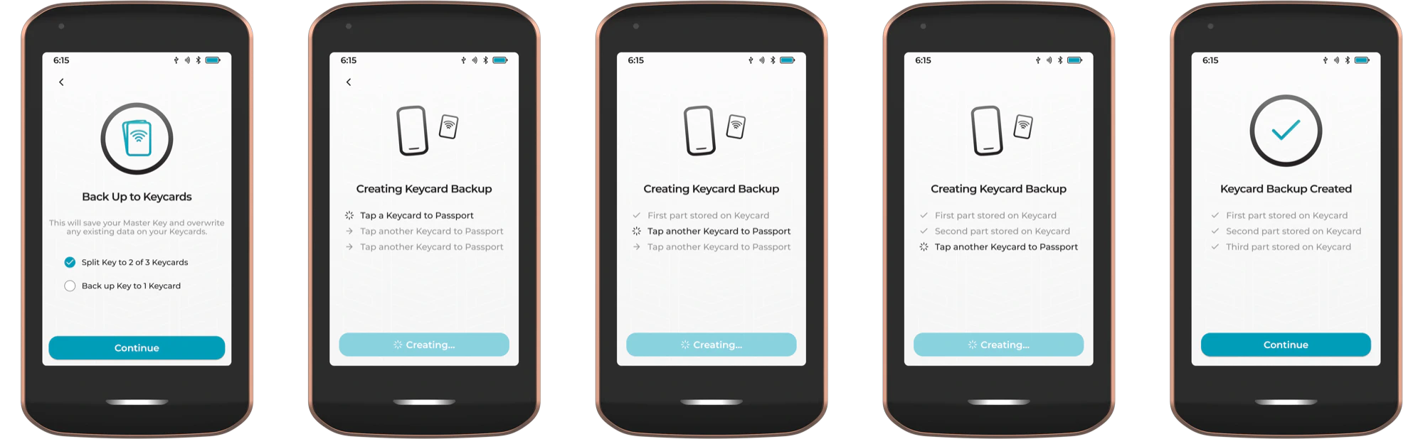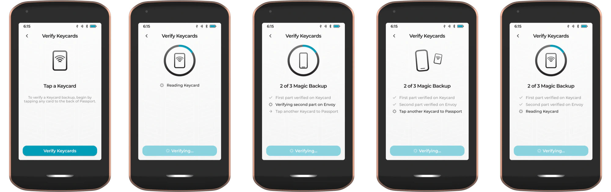 Use this feature to verify Prime’s Master Backup Keycards at any time. Simply tap a Keycard to the back of Prime for the device to detect that the card is part of a given backup set. Prime will then prompt for the remaining cards to be presented. Once the entire quorum of parts has been successfully retrieved, Prime will show a success message.