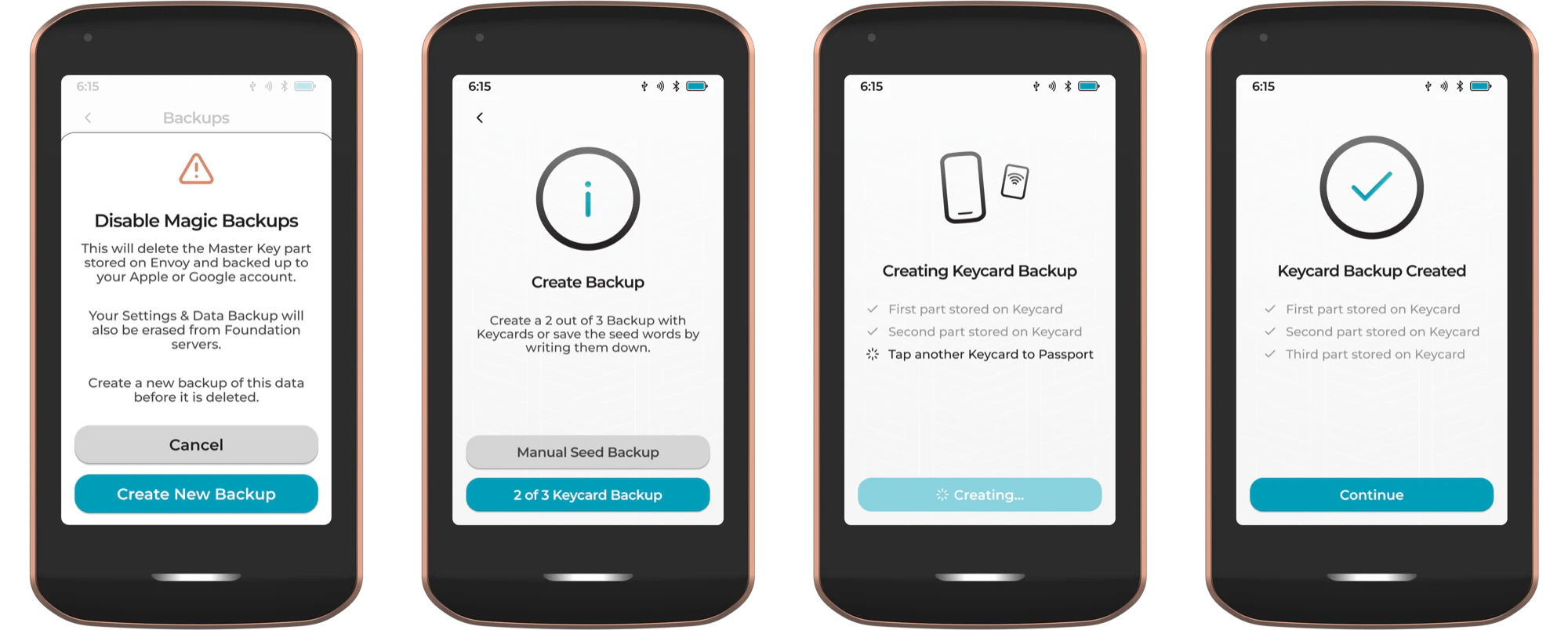 Users that want to disable Magic Backups can do so by tapping the toggle. This will delete the Master Key part stored on Envoy and backed up in the Apple or Google account. The Settings & Data Backup will also be erased from Foundation servers.